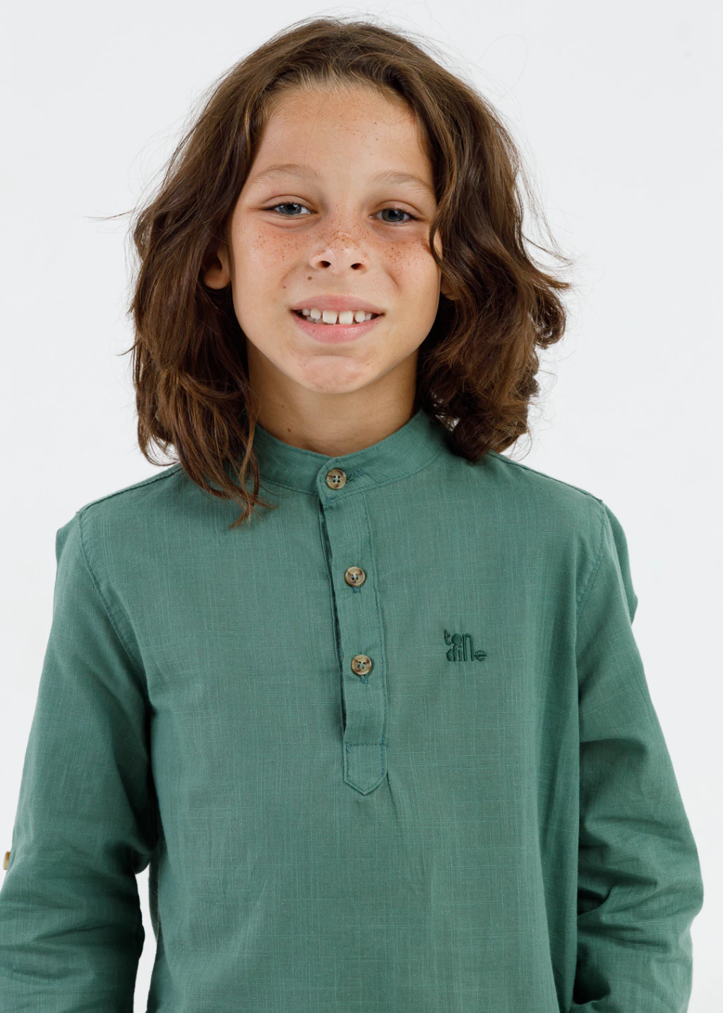 Com tecido que imita um linho, possui toque macio e detalhes que fazem a diferença. A modelagem gola padre, abertura frontal em botões e Bordado. Com martingale, podendo encurtar o comprimento das mangas. Uma peça chave para eventos especiais, leve e sofisticada. Os meninos vão arrasar!!